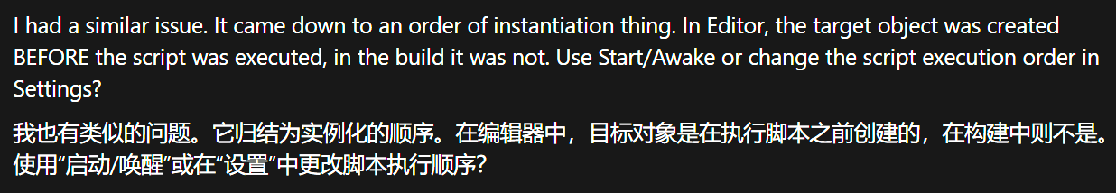 如果真是这样的话,不明白为什么 Unity 要这么设计。我似乎明白了一部分原因:我的代码可能在非Awake和Start的地方去获取了一些在场景里的物体(Awake和Start是一定会在物体生成之后执行的),但我写的代码一进场景就获取物体,物体还没加载出来,所以就 Null Ref 了。所以如果要一开始获取场景内的物体话应该是要写在 Start 或者 Awake 里。之后还是用代码单一入口然后驱动其他实例动态加载场景吧。