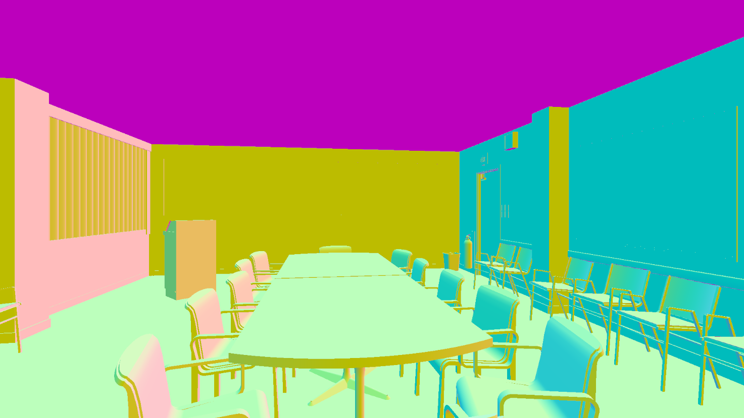 ps:在实现过程中,我遇到了一个棘手的问题。当使用栈来实现光线与BVH的相交判断时,光线总是无法正确地与BVH相交,而使用循环时却可以。这个问题导致帧率极低,只能渲染出单一的信息。下图是单一信息图(分别是法线、BaseColor、阴影)