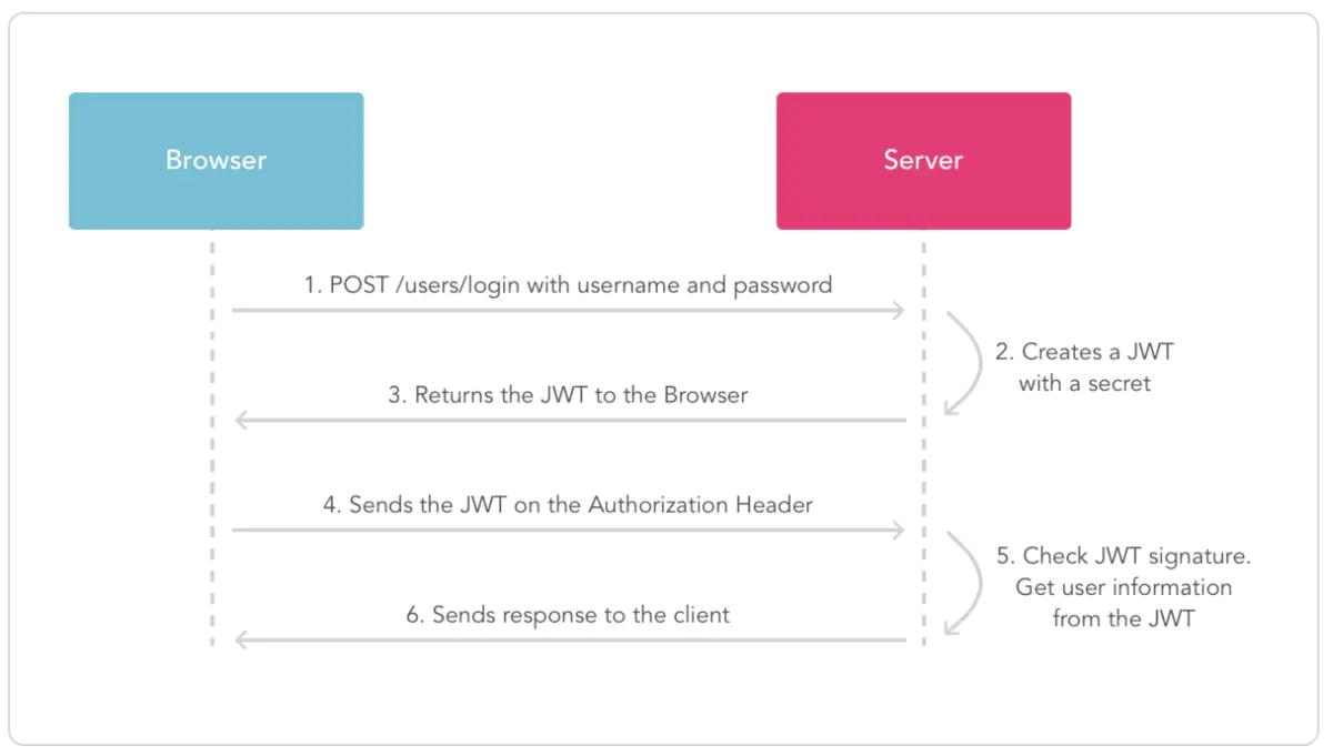 在身份验证中,当用户成功登录系统时,授权服务器将会把 JSON Web Token 返回给客户端,用户需要将此凭证信息存储在本地(cookie或浏览器缓存)。当用户发起新的请求时,需要在请求头中附带此凭证信息,当服务器接收到用户请求时,会先检查请求头中有无凭证,是否过期,是否有效。如果凭证有效,将放行请求;若凭证非法或者过期,服务器将回跳到认证中心,重新对用户身份进行验证,直至用户身份验证成功。以访问 API 资源为例,下图显示了获取并使用 JWT 的基本流程: