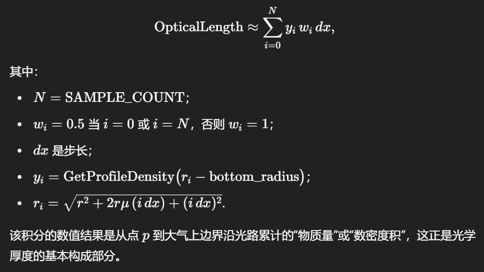 }原理也是与上面的二次方程一样,只不过把 top_radius(大气半径) 换成了 bottom_radius(地球半径)。通过判别式来判断是否与地面相交或者计算射线长度。
