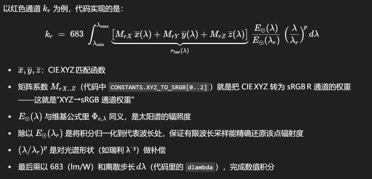ComputeSpectralRadianceToLuminanceFactors(Wavelengths, SolarIrradiance, 0, out sun_k_r, out sun_k_g, out sun_k_b);